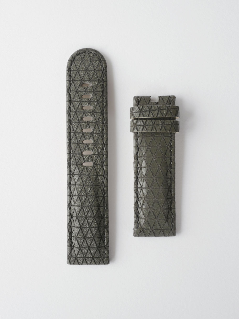 Very dark grey/green almost black leather with a criss pattern scored into the surface, Murray Mint lining and matching stitch.