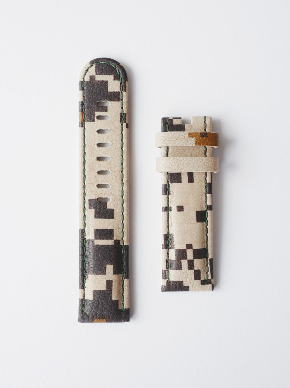 Military spec Desert Pixel Camo Leather Watch Strap with a pale beige leather lining and brown stitching.