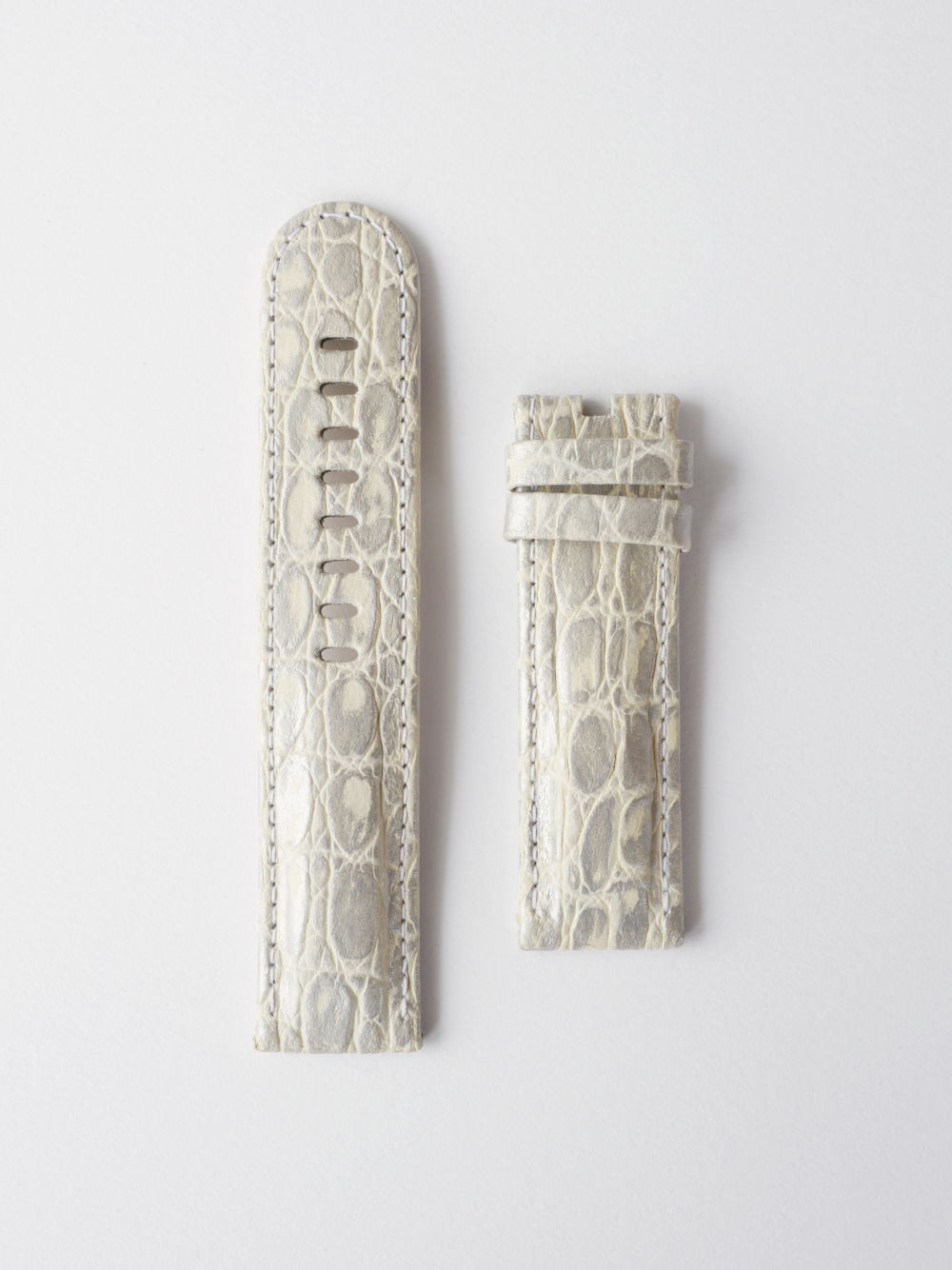 Of white with metallic silver highlights - faux croc embossed. Pale beige leather lining and white stitching. Limited edition.