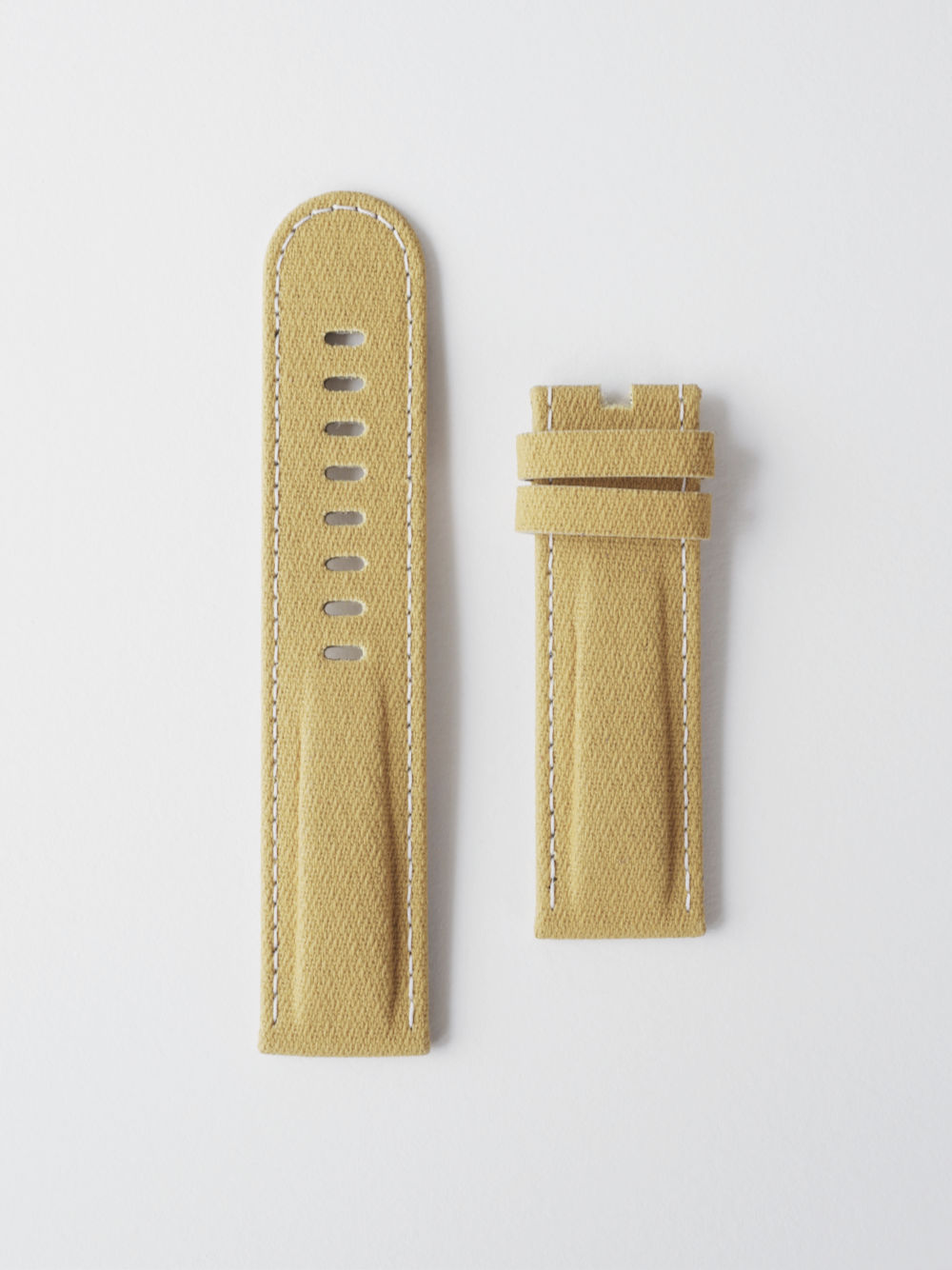 Mustard Millican ballistic nylon watch strap. Beige leather lining and white stitching.