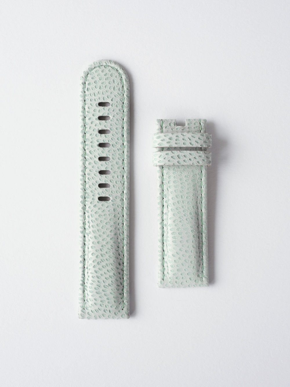 Detailed Sueded leather watch strap. Pretty pale green flecks. Beige leather lining and pale green stitching. Slightly rubbery feel.