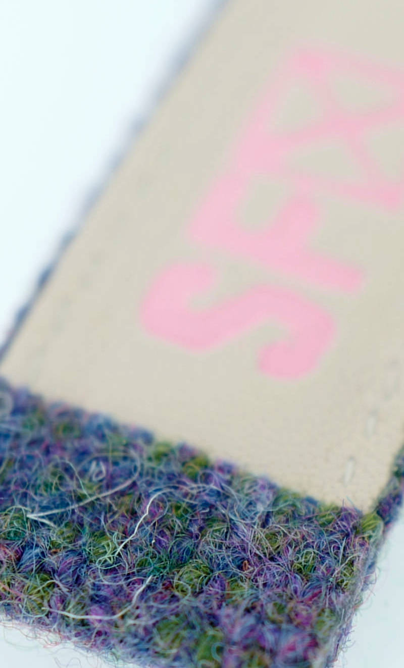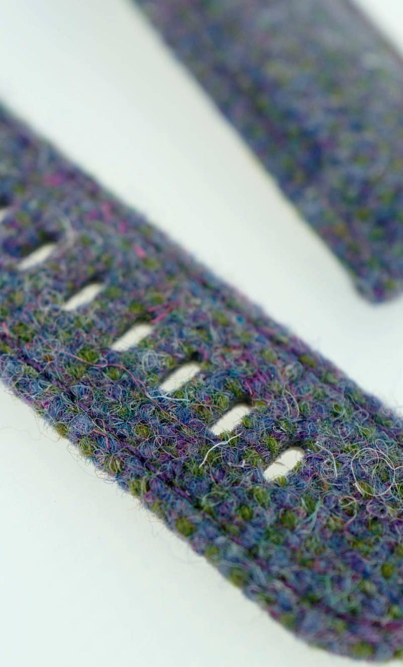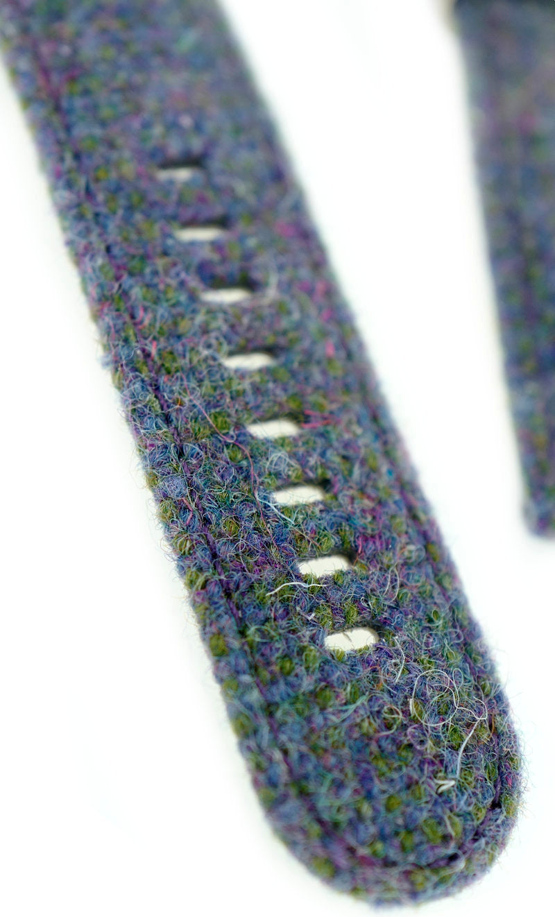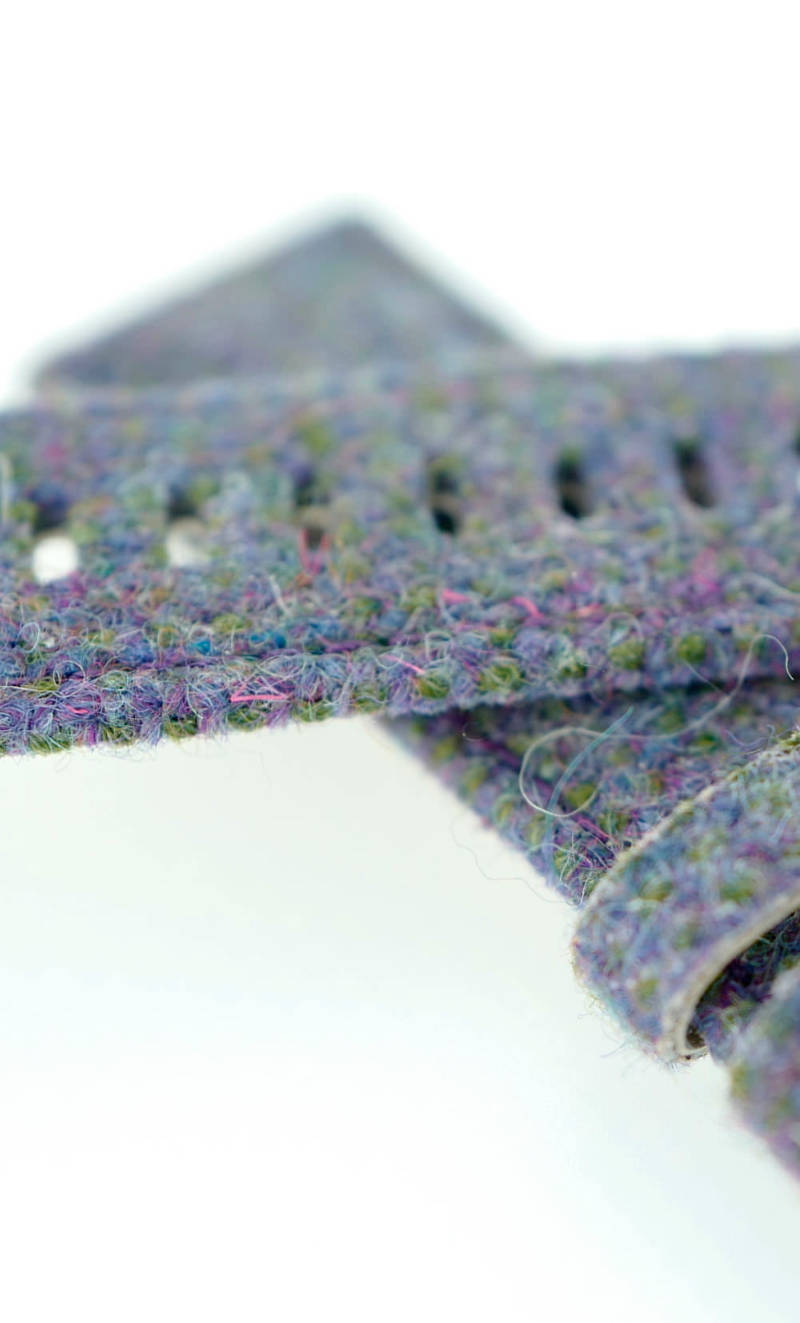 Heather purple with many coloured sprinkles AKA Some Bloke's Tweed. Beige leather lining and red stitching.