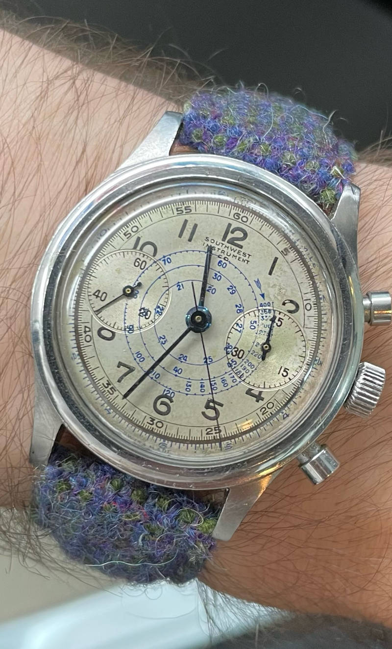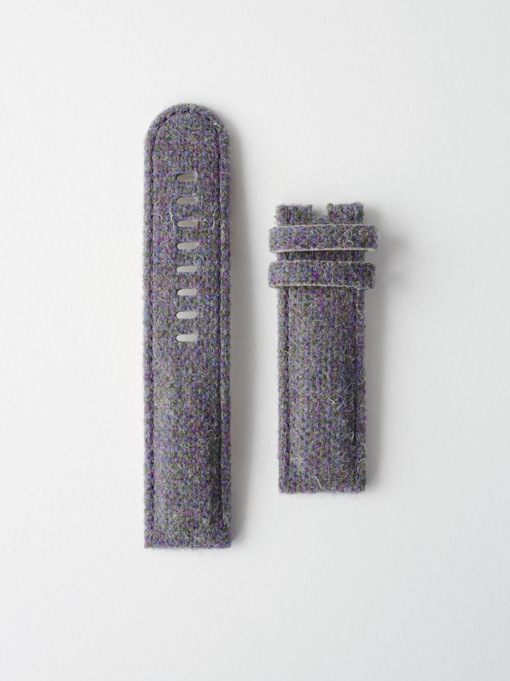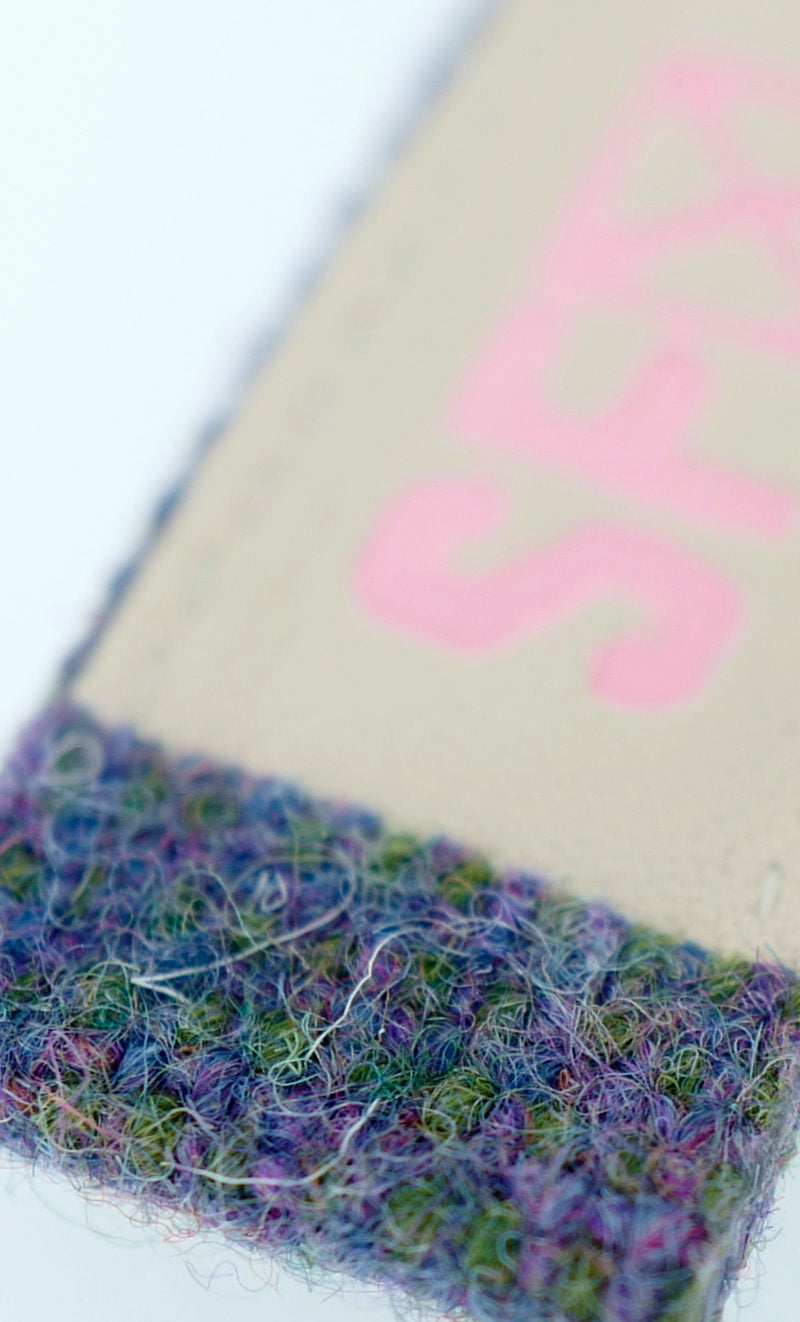 Heather purple with many coloured sprinkles AKA Some Bloke's Tweed. Beige leather lining and red stitching.